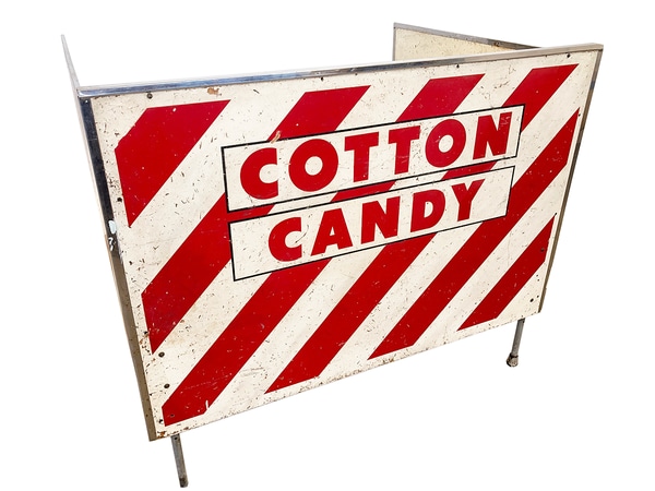 Carnival-style cotton candy stand with bold red and white striped panels and an integrated shelf for serving or storage. The vintage design ...