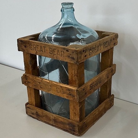 This vintage 5 gallon water jug, encased in a sturdy wooden crate, bears the branding "Great Bear Spring Co." Its rustic and authentic desig...
