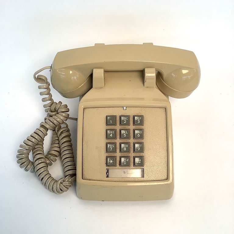 This beige push-button phone features a straightforward design with a coiled handset cord and numeric keypad. Perfect for sets depicting lat...